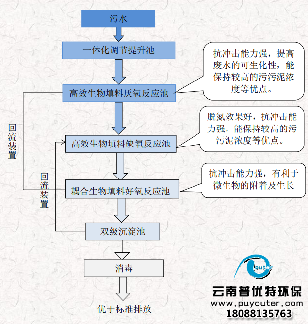 高效生物填料厌氧池(A)+高效生物填料缺氧池(A)+耦合生物填料好氧反应池(O)+双级沉淀池+消毒