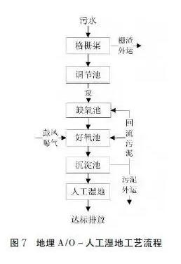 20、地埋A2/O-人工湿地技术:A2/O工艺亦称A-A-O工艺,本工艺为采用厌氧—缺氧—好氧法生物脱氮除磷工艺的简称,是流程最简单,应用最广泛的脱氮除磷工艺。适用于处理要求较高,四季气候变化大,气温较低的地区。处理规模不小于200吨/天。工艺参数:厌氧池停留时间不小于2h,缺氧池停留时间不小于4h,好氧池停留时间不小于6h,人工湿地水力负荷0.5~1.0m3/(m2˙d),污泥理周期180天,工艺流程见图9。