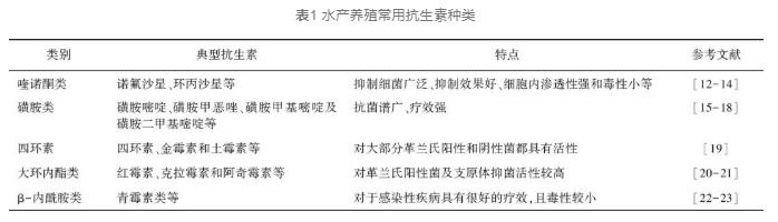 水产养殖中广泛应用和投入的抗生素类药物主要包括磺胺类、喹诺酮类、四环素类、β-内酰胺类以及大环内酯类5大类(表1)。兽医临床上最常用的兽用喹诺酮类药物有诺氟沙星、环丙沙星、恩诺沙星、氧氟沙星等,具有生物利用度好、体内代谢稳定、抗菌谱广和抑菌高效等优点,广泛应用于气单胞菌及弧菌等细菌性疾病的预防与治疗,研究表明可治疗美洲鳗鲡气单胞菌属等细菌性疾病。